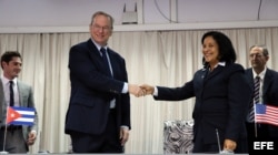 El presidente Ejecutivo de Google, Eric Schmidt (d), y la presidenta de (Etecsa), Mayra Arevich Marín (i).